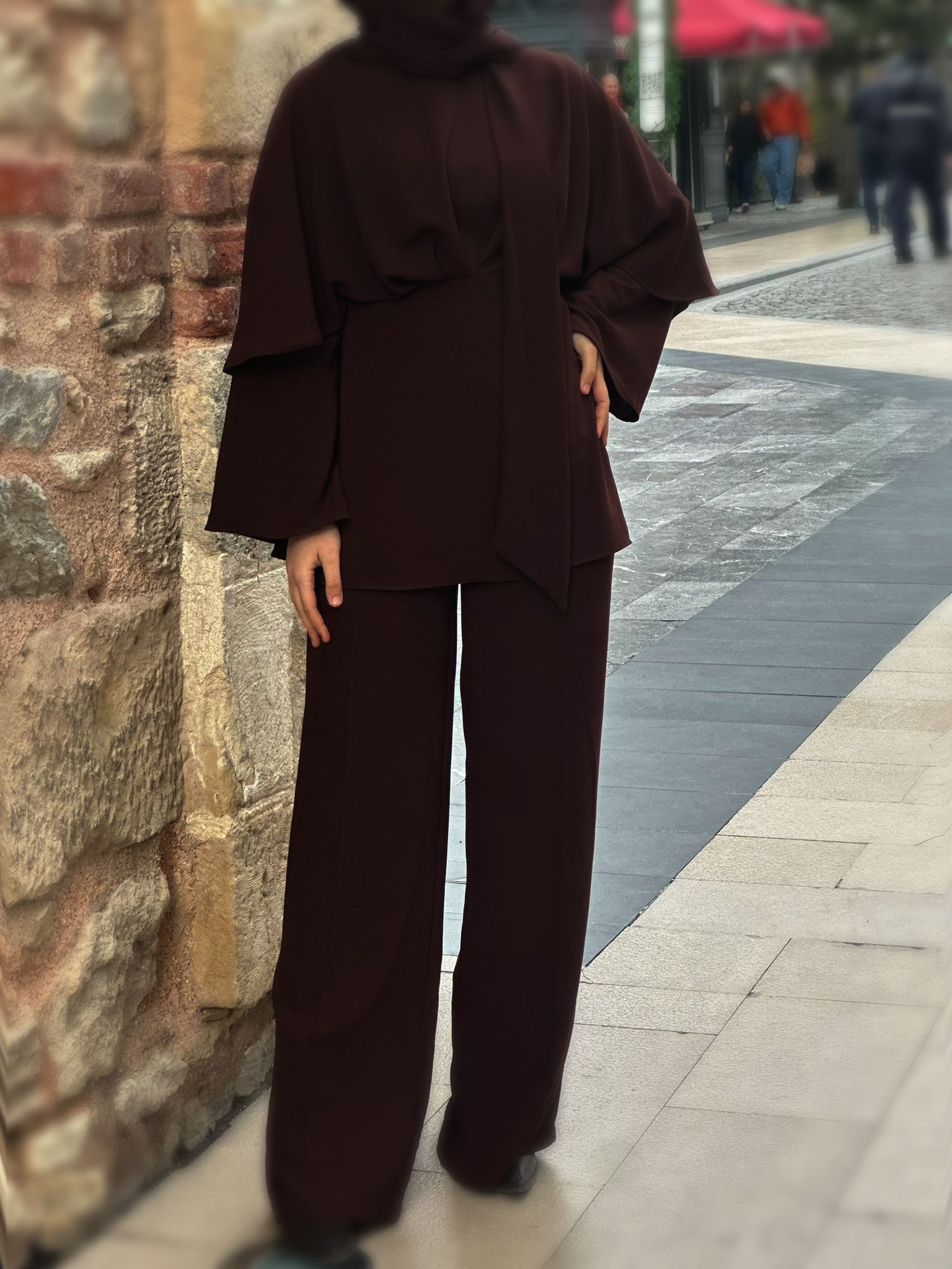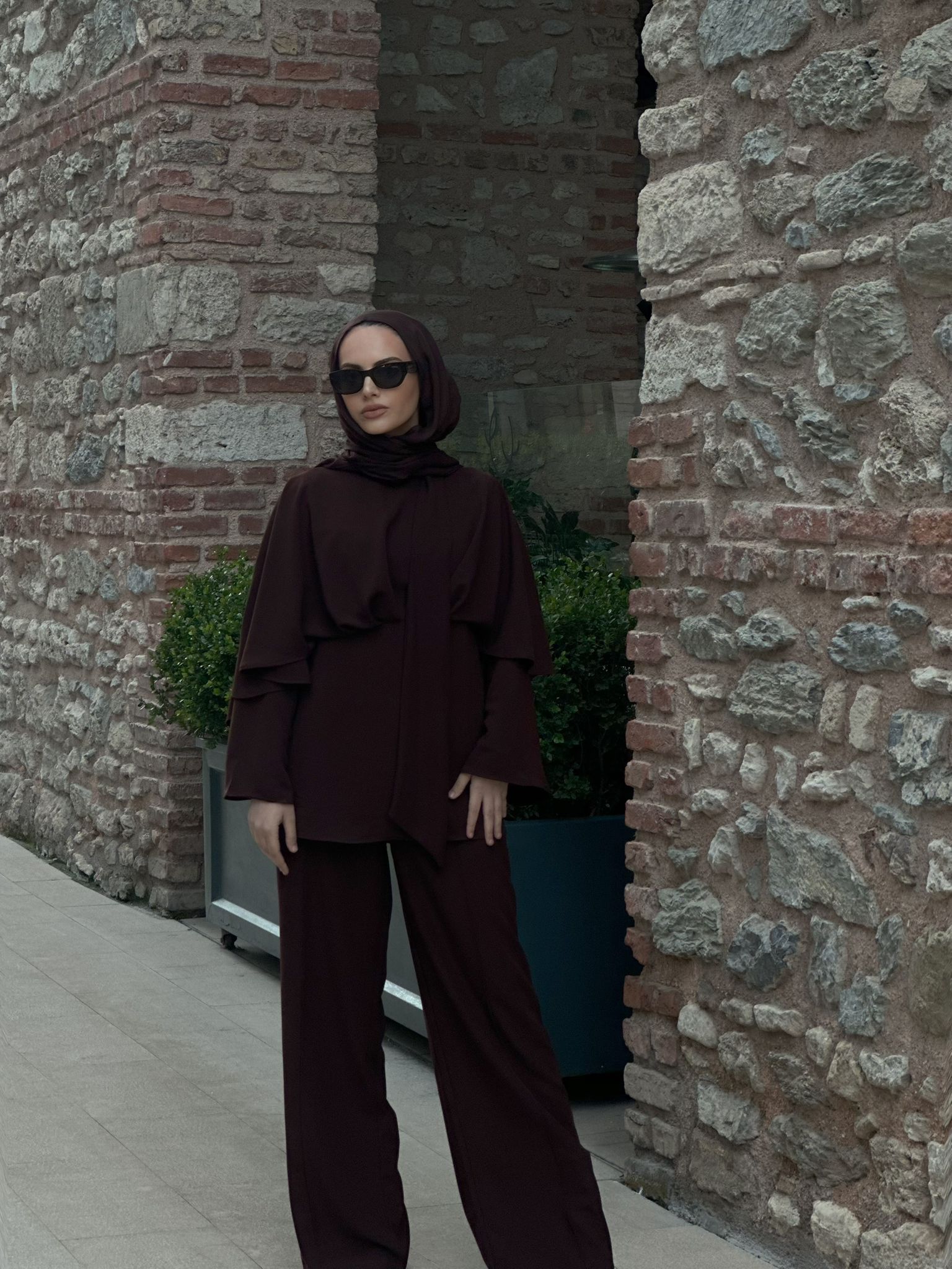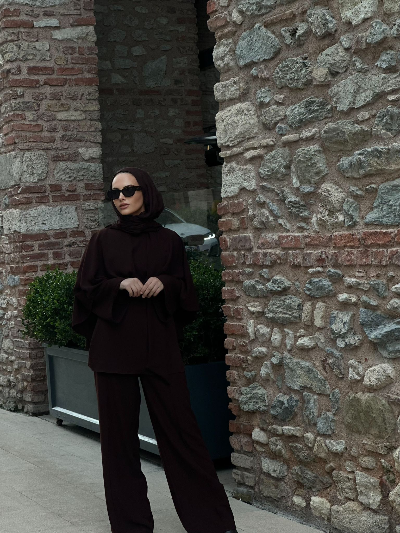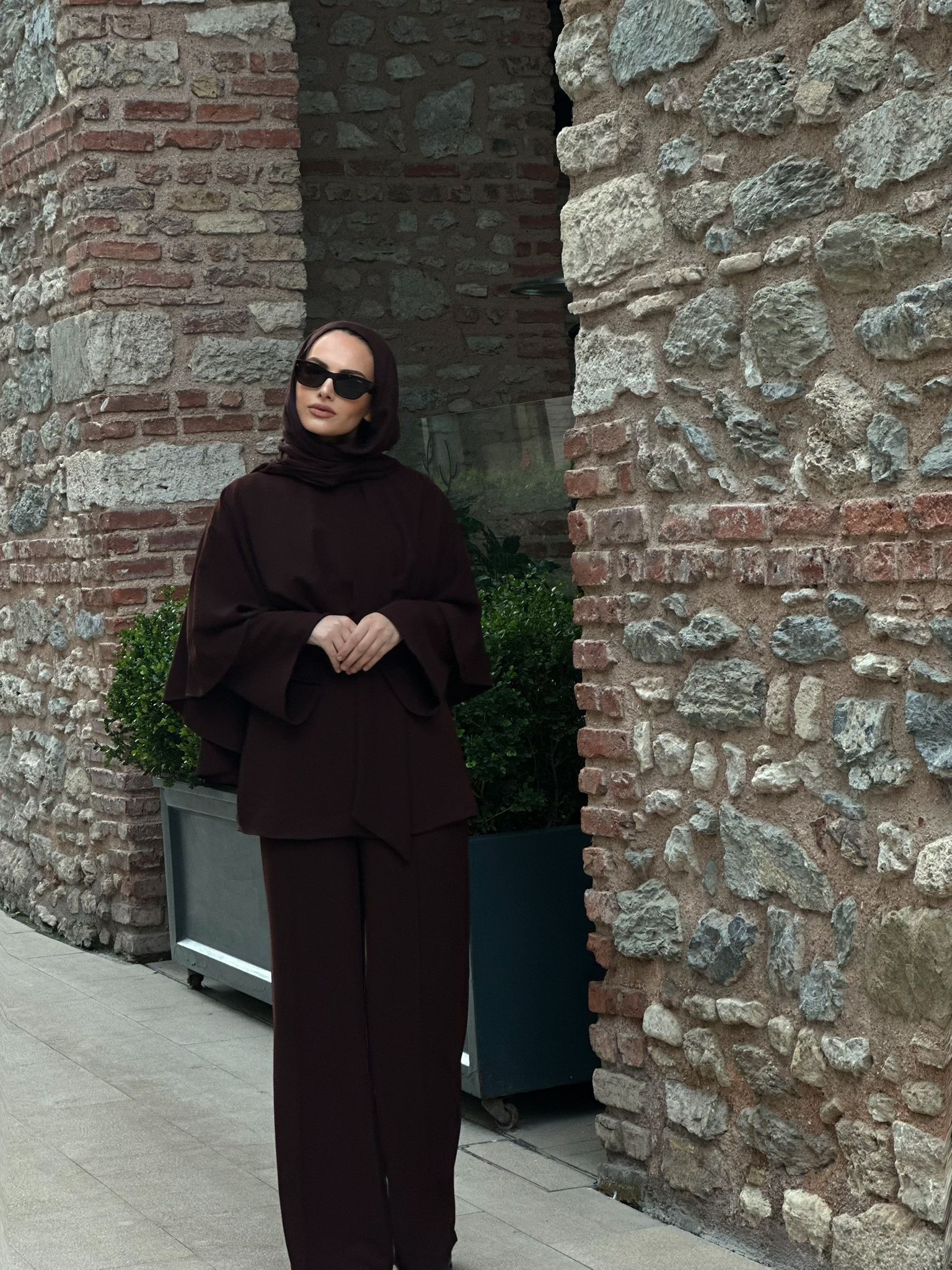 Renk: Acı Kahve Kumaş: Dökümlü, krep görünümlü, serin ve iç göstermeyen yapı Kalıp: Dar kalıptır (rahat kullanım için bir beden büyük tercih edilebilir) DAR KALIP